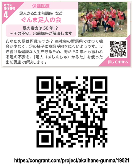 そこで、上毛かるたになじんでいる群馬県民にとって、かるたは格好のツールではないかと思いつき、ここに「足人かるた」制作のクラウドファンディングにチャレンジする次第です。ぐんま足人の会には、さまざまな職種が集まっているので、それぞれの専門性を生かし、五十音に伝えたいことを乗せて仕上げていきます。返礼として、完成した足人かるたをお渡しするのに加えて、特に企業様などに足に関するセミナーを行う出前講座も企画しています。